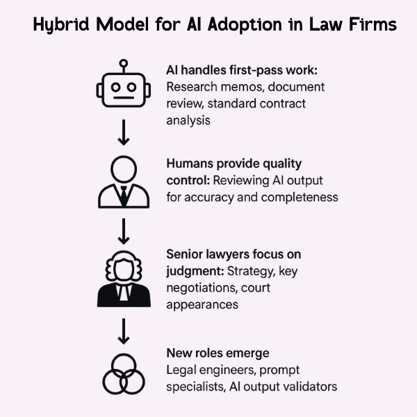 Most law firms adopting AI tools are doing so to reduce costs and improve speed and accuracy, while retaining a high amount of human involvement in strategic thinking, novel argument creation, and client-facing tasks. In short, many firms are evolving to a hybrid approach, that can look like this: