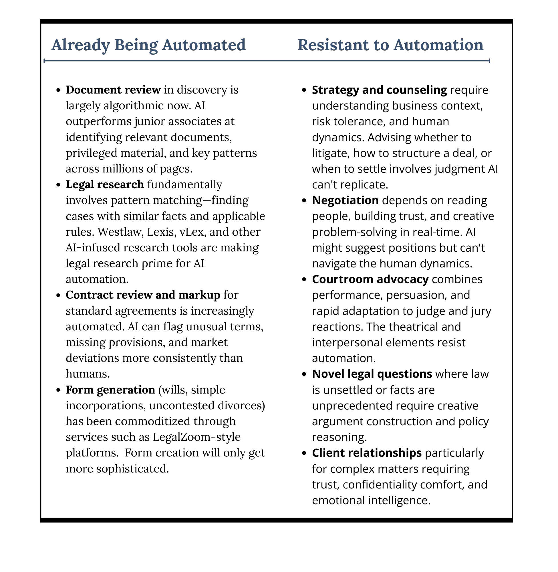 Law is particularly interesting because it straddles both categories. Much of traditional legal practice involves pattern matching: finding relevant precedents, identifying standard contract issues, completing forms. But the application of law to novel facts, strategic decision-making, and human persuasion require sophisticated judgment. In law, therefore, we will see a mix of roles being displaced by AI, and others remaining resistant.
