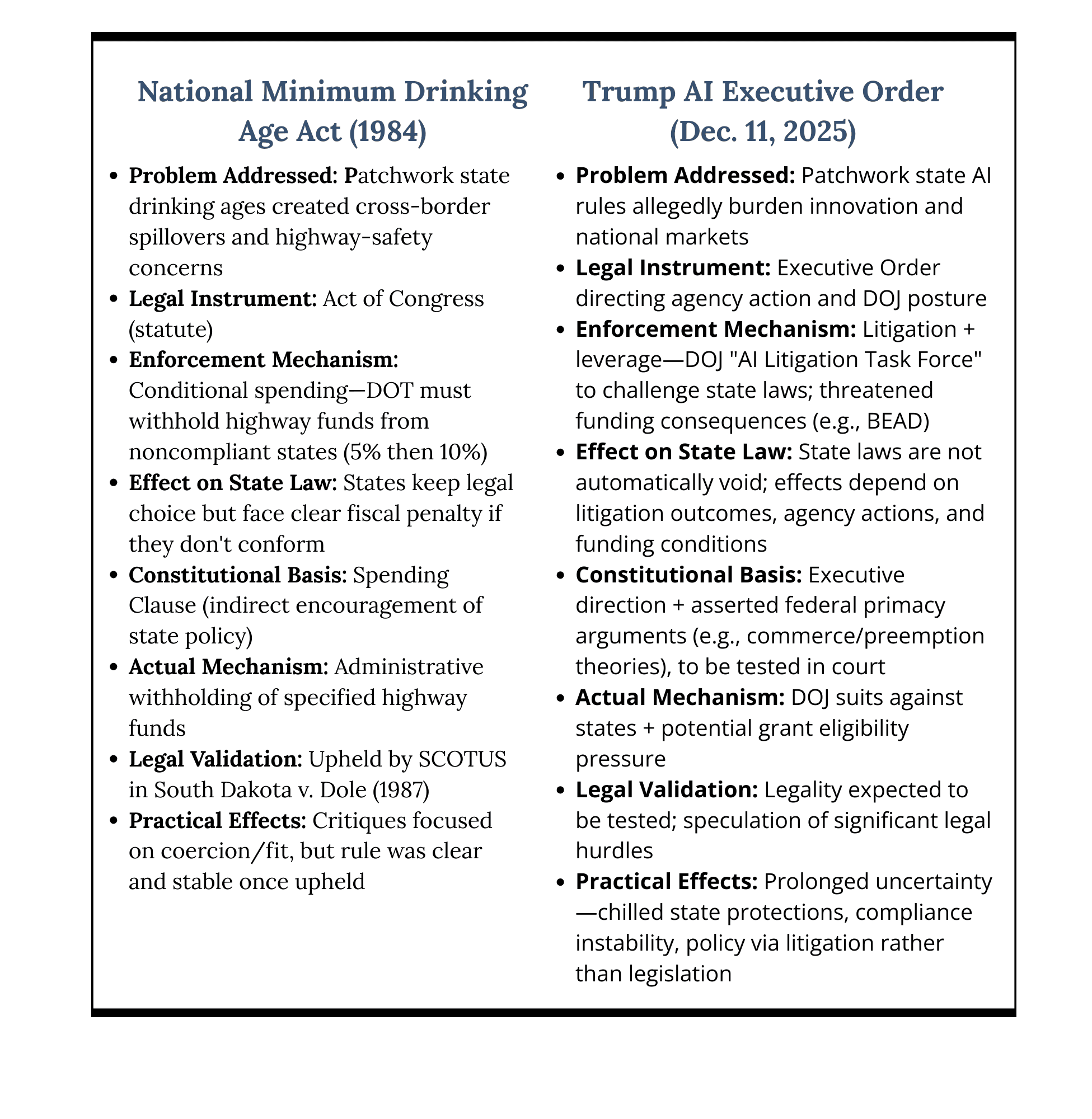There is a meaningful difference between national uniformity achieved through legislation and “national uniformity” pursued through an executive directive aimed at challenging state policymaking. The minimum drinking age offers a useful comparison because it shows how the federal government has historically responded to a state-by-state patchwork using tools that are at least structurally transparent and democratically accountable—namely, a statute and a clear incentive mechanism—rather than a broad, litigation-forward campaign to deter state experimentation. That contrast helps clarify what is unusual (and potentially risky) about the AI executive order’s approach.